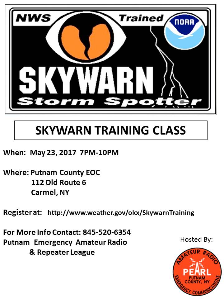 PEARL is hosting a SKYWARN Spotter Training class this May 23rd at 7:00 PM at the Putnam County EOC.
